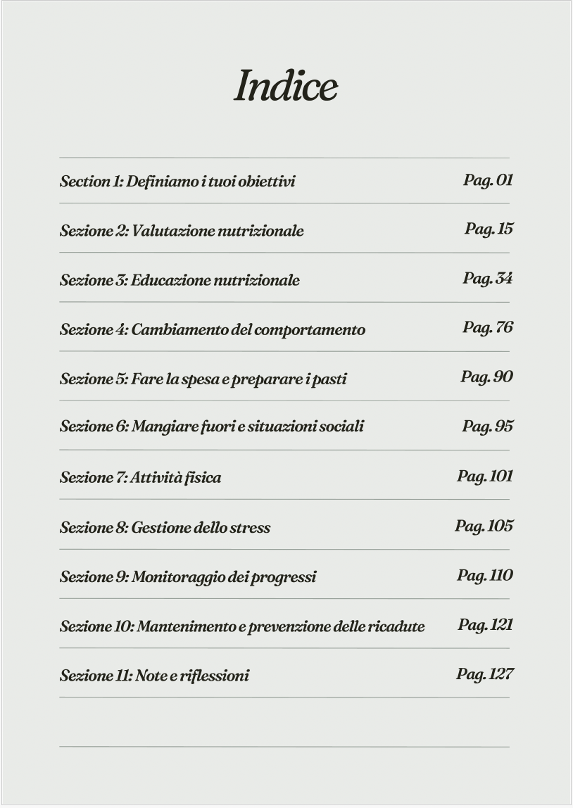Questo workbook è una guida operativa, pensata per aiutarti a migliorare la relazione con l’alimentazione attraverso un approccio concreto, educativo e progressivo. È ideale per chi sta seguendo un percorso nutrizionale o psicologico e desidera uno strumento da compilare che accompagni il cambiamento giorno dopo giorno.